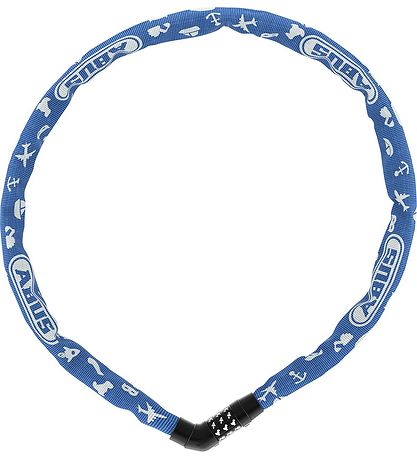 Magnifique cadenas à chaîne Abus en bleu avec une imprimé blanche de divers symboles.