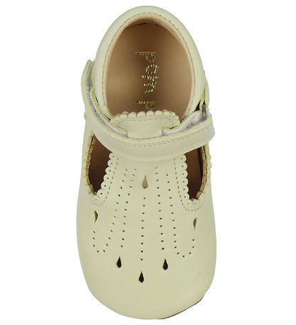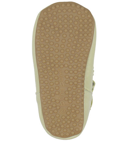 les chaussons Pom Pom se ferment avec une étroite bande velcro sur le cou-de-pied, ce qui permet d'ajuster facilement la chaussure au pied de l'enfant, les chaussons sont bien rembourrés dans l'ouverture pour qu'ils soient confortables à Have. L'intérieur les chaussons est doublé de cuir et le dessous est doté de semelles en cuir souples et amovibles. Les semelles extérieures sont en caoutchouc avec de petits boutons, qui assurent un bon maintien du pied.