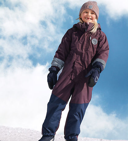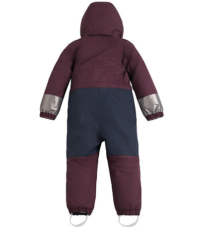 Jolie combinaison de ski Viking en violet raisin foncé et avec des pièces bleu marine dans les zones de fentes classiques ; les fesses ainsi que les genoux et les tibias. La Combinaison de ski comporte plusieurs détails réfléchissants, dont un logo tour réfléchissant sur la poitrine gauche et de larges bandes réfléchissantes au bas des deux manches.