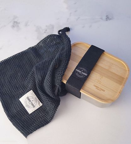 Le Yummii Yummii est livré dans un sac en filet noir certifié GOTS. Il est parfait pour les boîtes à repas Bento en medium+, et se fixe avec l'élastique autour de la boîte à repas.