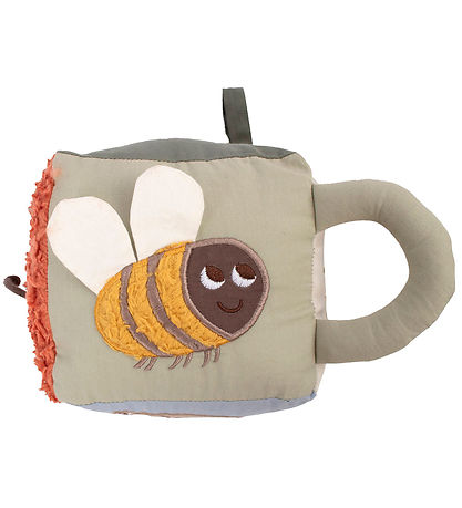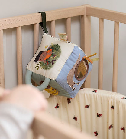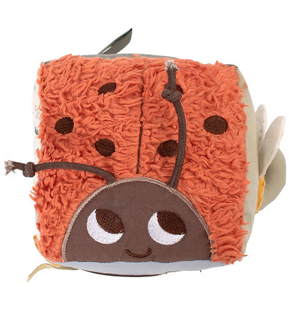 Le cube d'activités Filibabba est carré et rempli de détails stimulants tels que miroir, cloche, illustrations, crépitements, ficelles et tissu : il y a donc beaucoup de choses à explorer pour les petites mains, notamment la page avec une coccinelle dans un ours en peluche.