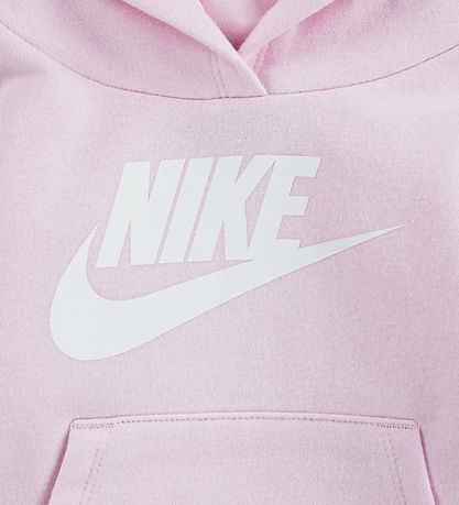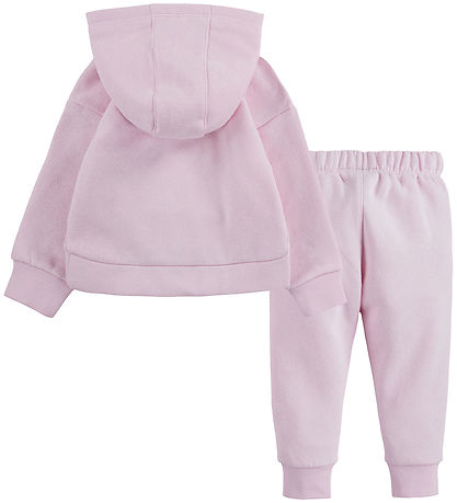 Joli ensemble de jogging Nike, composé d'un sweat à capuche et d'un pantalon de pantalon de jogging de couleur rose, et un logo blanc est imprimé sur le devant du sweat à capuche et en haut de la jambe gauche du pantalon.