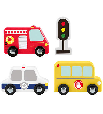 De magnifiques voitures en bois Fisher-Price, représentant un camion de pompiers rouge, une voiture de police blanche, un bus scolaire jaune et un feu de circulation. Ce forfait de petits véhicules captivants promet des heures de jeu et de divertissement aux plus petits.