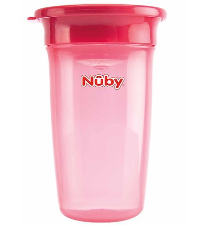 Joli tasse Nuby en plastique rose avec le logo de la marque sur le devant.