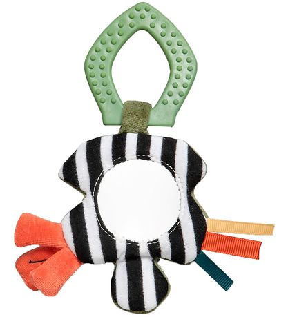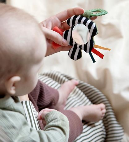 Le hochet d'activité Sebra est constitué d'un anneau de dentition à boutons, avec une feuille au sommet. D'un côté de la lame se trouve un miroir. La feuille comporte des étiquettes zéro colorées en haut, avec lesquelles les plus petits peuvent jouer.