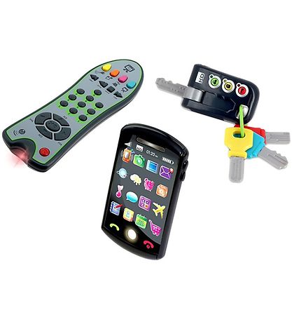 jouets Fun Infini Fun sous la forme d'un smartphone, d'un set de clés et d'une télécommande. Les trois parties sont toutes noir et gris avec de nombreux détails colorés.