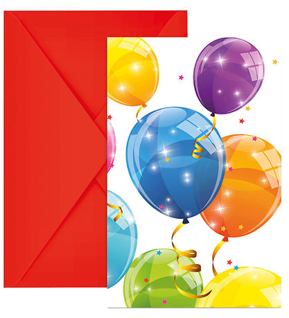 Invitations Decorata Party originales avec un imprimé ballons brillants, de jolies couleurs et des enveloppes rouge de couleur unie. Vendues par 6 Pack, elles comprennent les invitations et les enveloppes.