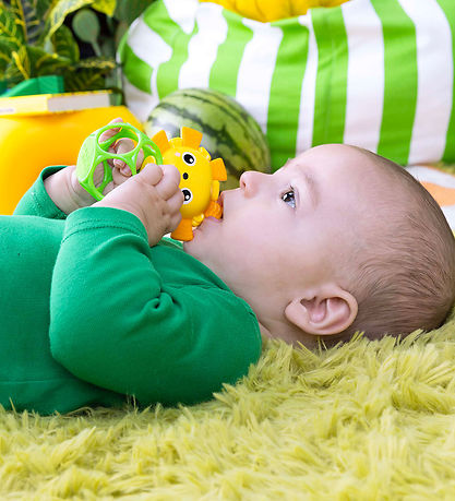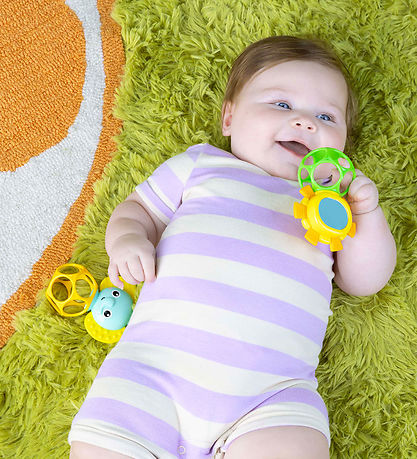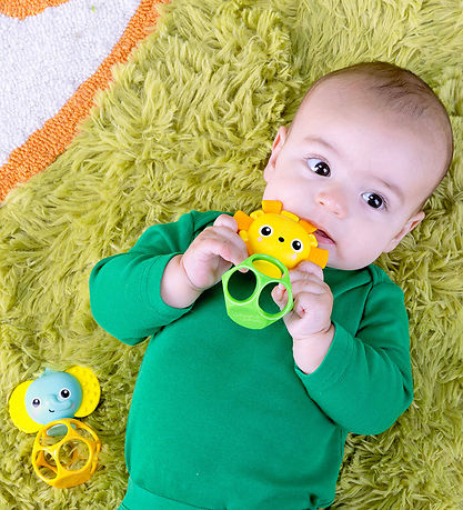 Le jouet Bright Starts est un anneau de dentition smart fabriqué à partir de la technologie Oball, flexible et durable, facile à tenir pour bébé. Le jouet comporte de nombreux trous plus grands qui facilitent la préhension par bébé et favorisent la motricité fine. À l'arrière de la tête de lion se trouve un petit miroir qui favorise la découverte de soi et à l'intérieur de la tête de l'éléphant se trouvent des perles amusantes.