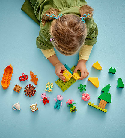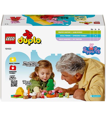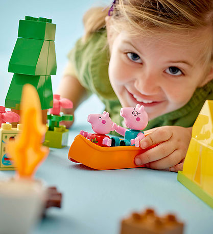 set LEGO® DUPLO coloré avec 32 blocs de construction, conçu pour les jeunes enfants. Ensemble comprend des figurine jouet de Peppa pig Pig et de sa famille ainsi que des éléments tels qu'une tente, un feu de camp, un bois et un canoë.