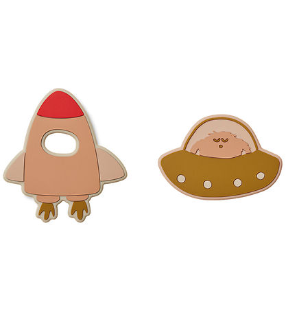 jouet mordeur amusant Liewood en 2 Pack avec une fusée spatiale et un OVNI en beige, rose, marron doré et rouge.