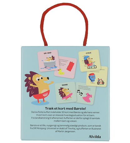 La valise Alvilda contient 30 cartes différentes représentant Børste et tous ses amis. Chaque carte illustre une situation classique du quotidien d'un enfant, du brossage des dents au dîner, ce qui en fait un lieu idéal pour une conversation entre enfants et adultes.