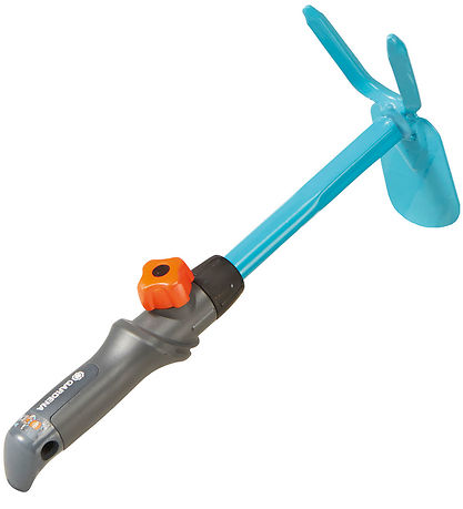 Outil de jardin pratique Gardena en forme de houe en métal bleu avec un manche gris.