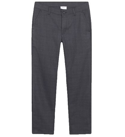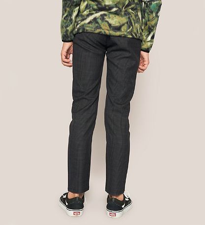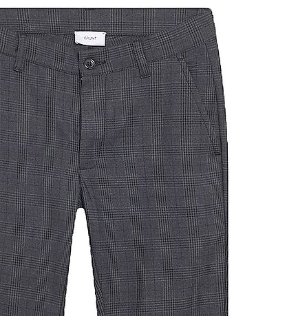 pantalon fin Grunt gris foncé à carreaux noir et marron clair.