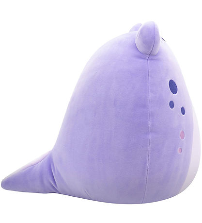 Mignon peluche Squishmallows en forme de Nahomy le têtard dans les tons violets et à points. Peluche est conçu comme un oreiller tour avec un visage et des détails brodés.