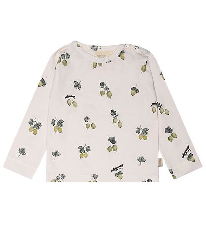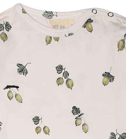 Magnifique blouse Petit Piao blanc avec un imprimé all-over de groseilles à maquereau sur branches dans des tons de vert.
