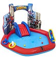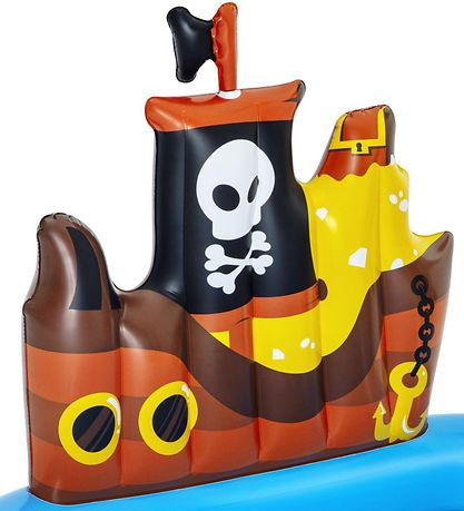 piscine gonflable pour enfant amusante Bestway de couleur bleue, avec un mur d'un côté qui ressemble à un bateau pirate. Diverses activités sont incluses :