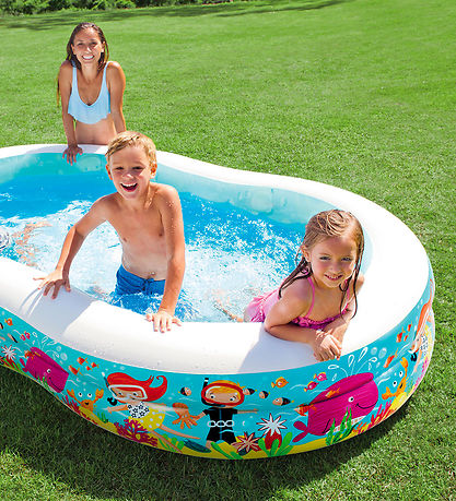 Belle piscine Intex en bleu et blanc avec un joli impression sous-marin à l'extérieur.