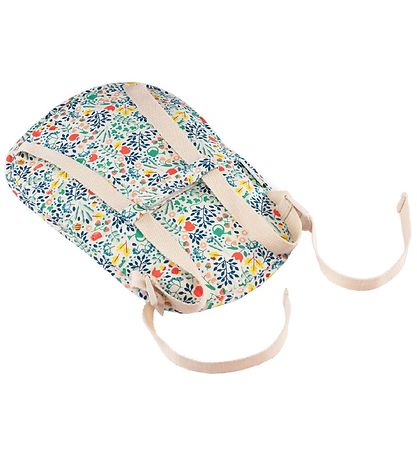 porte-bébé bébé Smart Lilliputiens pour poupée avec un fin imprimé floral dans les tons bleu, vert, rouge et jaune d'un côté et turquoise de couleur unie de l'autre côté. Les sangles élastiques sont de ivoire blanc, tout comme le siège lui-même, qui est en polaire pilou douce.