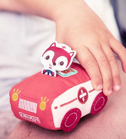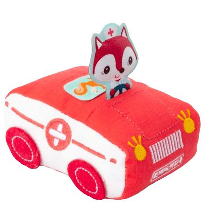 Belle voiture à traction Lilliputiens rouge et blanche, avec un renard comme conducteur.