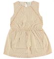 Robe Fin En Fant beige à a rayures verticales roses et beiges.