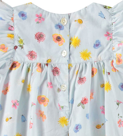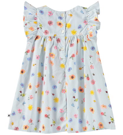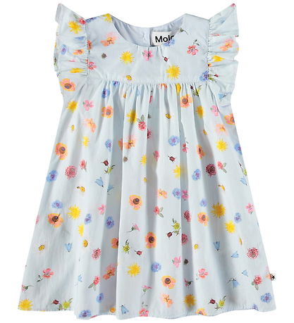 Jolie robe Molo bleu clair avec un imprimé floral original aux couleurs variées. Sans manches, Molo est ornée de jolis volants aux épaules. Robe coupe en A est élégante et se ferme par des boutons au niveau du cou. Robe léger et serré est de qualité.