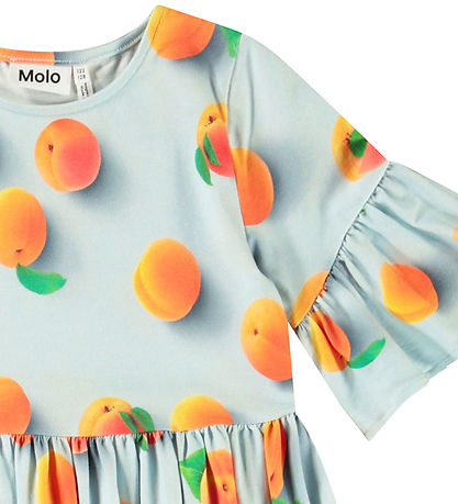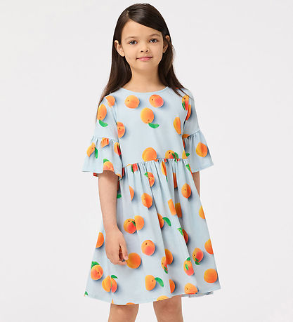 Jolie robe Molo bleu clair ornée d'un magnifique imprimé abricot et corail. Molo manches courtes sont ornées de larges volants élégants qui créent une silhouette légère et aérienne. La jupe est ample.