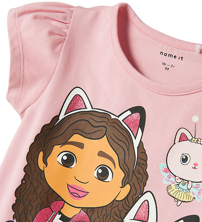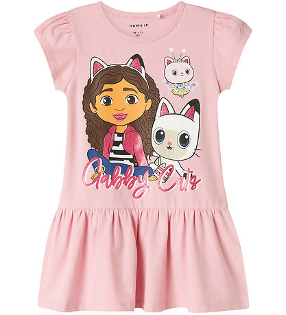 Robe colorée Name It en rose avec un grand imprimé sur le devant du personnage Netflix Gabby et un chat mignon. L'imprimé présente de jolis détails pailletés. La robe Name It a une encolure tour et des manches courtes avec de petits détails plissés aux épaules. La Robe est coupée à la taille, là où la jupe a une belle largeur.