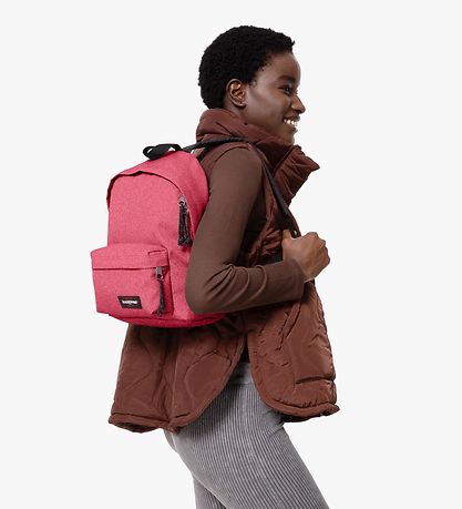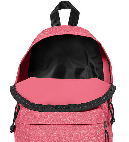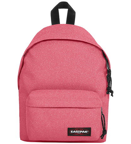 Joli sac à dos Eastpak en rose de couleur unie avec des brillant et un patch logo noir sur le devant.