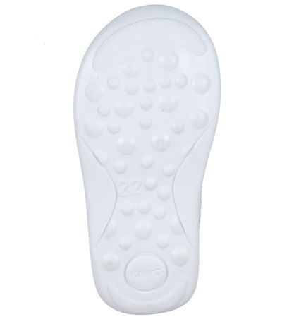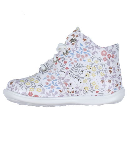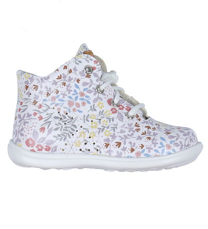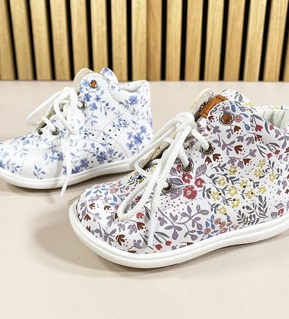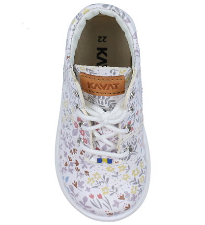 Magnifiques sandale d'apprentissage à la marche Kavat en cuir enduit blanc avec un imprimé floral multicolore sur toute la surface et d'adorables détails de surpiqûres. Les chaussures ont une étiquette marron avec le Kavat sur la languette.