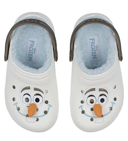 Jolies sandales Crocs blanches avec un joli design Olaf 3D sur le pied. Les Sandales ont une doublure bleu clair.