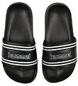 Magnifiques sandales de plage Hummel en noir. Sur chaque bracelet figure le nom de la marque «Hummel» entre des lignes blanches.