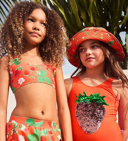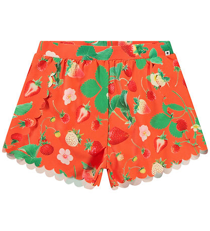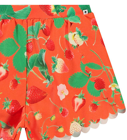 Short de bain élégant Molo en rouge avec un imprimé de fraise, de feuilles et de fleurs.