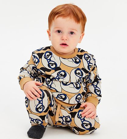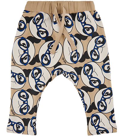 pantalon de jogging Smart The New Siblings en beige avec un imprimé de pandas en noir et blanc avec des lunettes bleues.