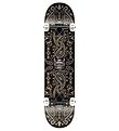 Magnifique skateboard Enuff noir avec un imprimé au dos d'un squelette sur un skateboard dans de belles nuances de rose et de bleu clair.