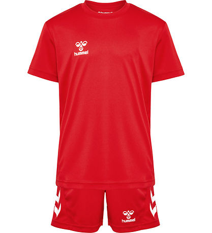 Ensemble d'entraînement Fresh Hummel survêtement d'un t-shirt à manches courtes et d'un short de couleur rouge vif, orné d'un joli imprimé logo sur le devant. Ensemble se compose d'un t-shirt et d'un short, idéal pour le jeu et l'activité.