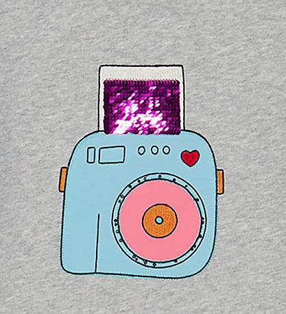 Joli sweat Freds World à manches longues en gris chiné. Devant se trouve une grande application en forme d'appareil photo vert menthe et corail et décorée de paillettes réversibles violettes d'un côté et argentées de l'autre.