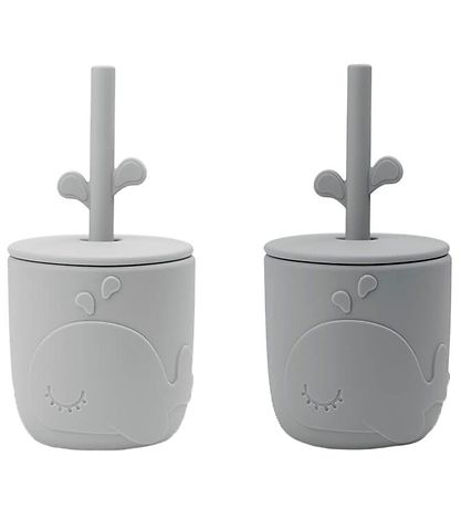 tasse pratique Done by Deer avec paille en marron clair et gris foncé vendu en 2 Pack. Sur le côté des tasses se trouve une baleine avec des éclaboussures d'eau. Les pailles ont une goutte d'eau de chaque côté, on dirait donc qu'elle vient de la baleine.