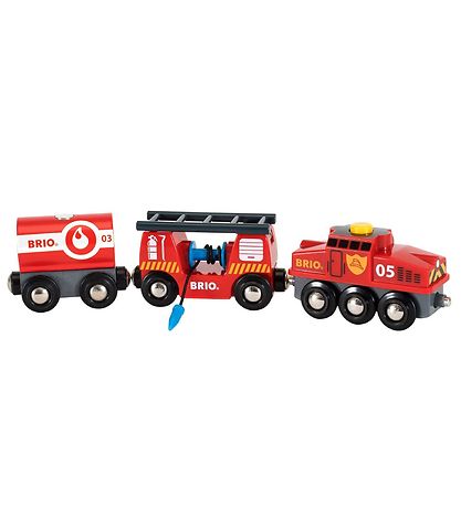 Le BRIO Fast aux wagons grâce à des aimants pratiques. Pour détacher rapidement les wagons de la locomotive, appuyez sur le bouton jaune de cette dernière. Un wagon est équipé d'une Échelle haute et d'une lance à incendie, permettant ainsi de s'approcher au plus près du feu. Le camion-citerne peut retirer la citerne.