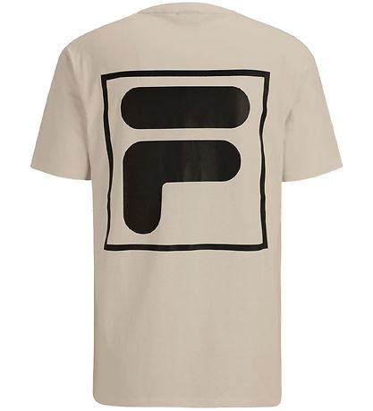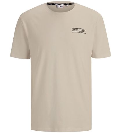 Joli t-shirt Fila de beige avec un imprimé de texte noir sur la poitrine gauche. Au dos se trouve un grand imprimé logo en noir.