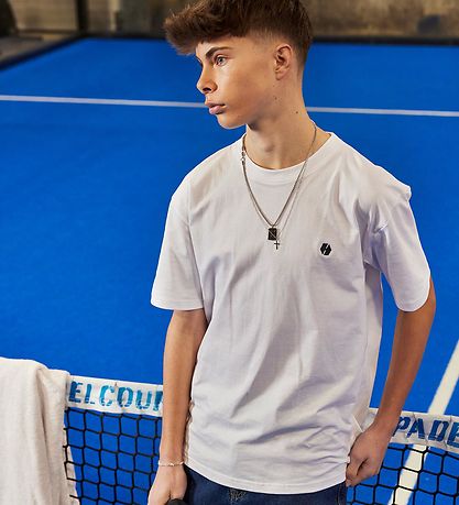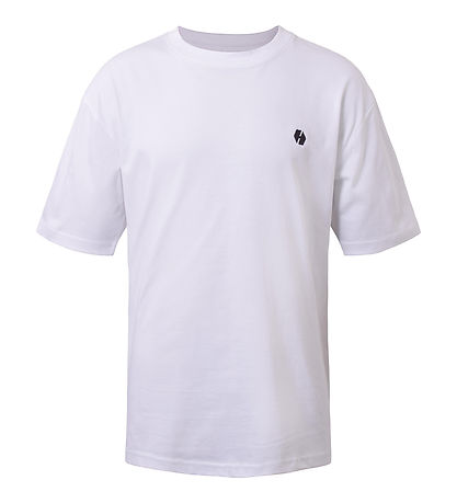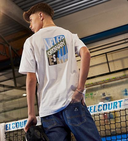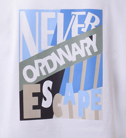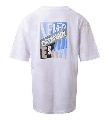T-shirt Nice Hound de couleur blanche de couleur unie avec un petit logo brodé en noir sur la poitrine gauche. Au dos se trouve un grand imprimé de « Never Ordinary Escape » dans les tons de bleu, vert, blanc et beige.