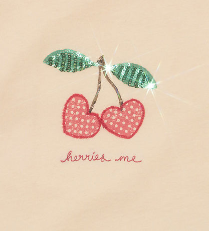 Charmant t-shirt Konges Sløjd beige clair avec un imprimé de cerises en forme de cœur sur le devant avec des détails brodés et des pailletes. Le T-shirt a une encolure tour et des manches courtes avec des coutures décoratives le long des bords.