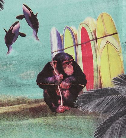 t-shirt Cool Me Too de gris charbon avec un grand imprimé sur le devant d'une plage exotique avec un singe, des surfboards et deux dauphins dans l'eau.