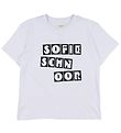 Magnifique t-shirt Sofie Schnoor en blanc avec un bel imprimé noir et blanc d'abricots et du texte sur le devant.