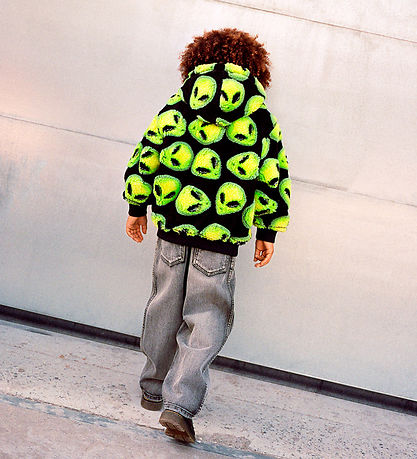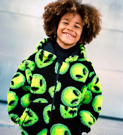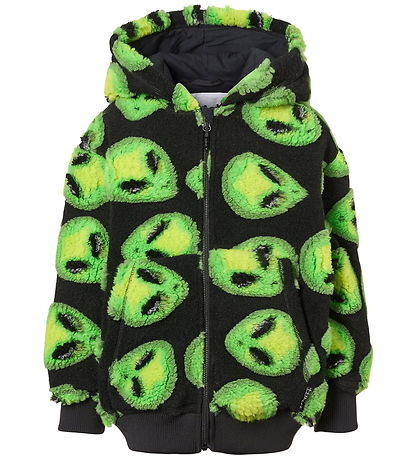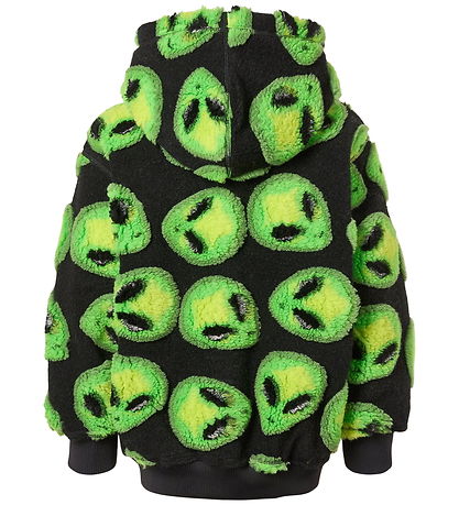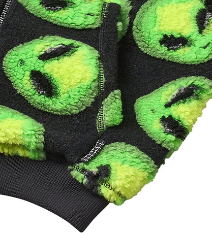 Veste polaire amusante Molo avec un motif de visages verts sur fond noir. La veste est en polaire pilou.