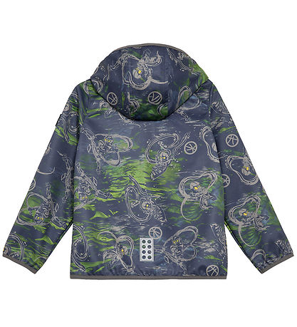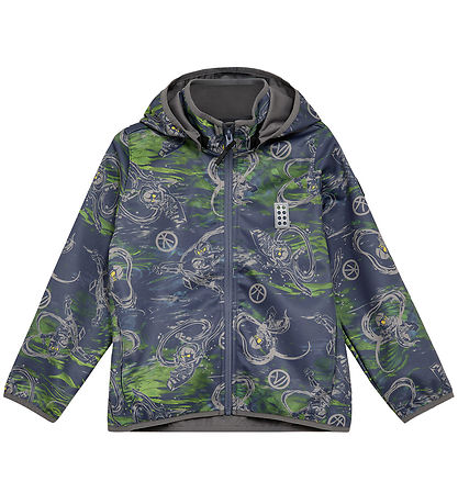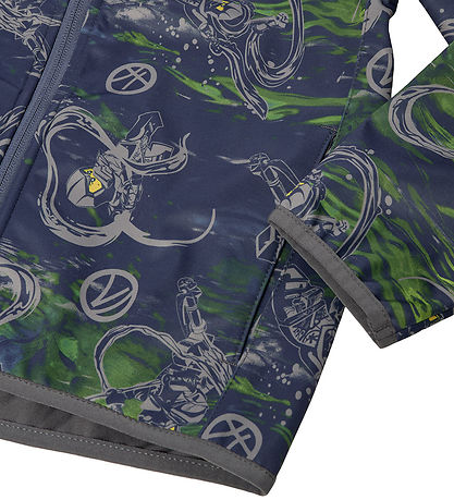 Magnifique veste softshell LEGO® Ninjago avec un imprimé intégral de Ninjago dans des tons bleu foncé, vert et gris.