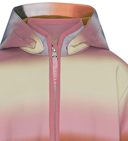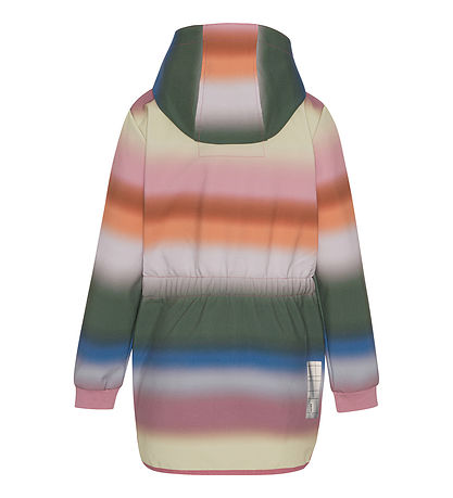 Magnifique veste softshell Molo avec de larges rayures arc-en-ciel qui se fondent les unes dans les autres dans des tons pastel. A l'arrière se trouve un grand réflecteur sur le côté droit.