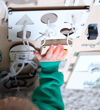 Fun Woobiboo Woobiboard en bois, qui regorge d'activités passionnantes, peintes en marron, beige et blanc.