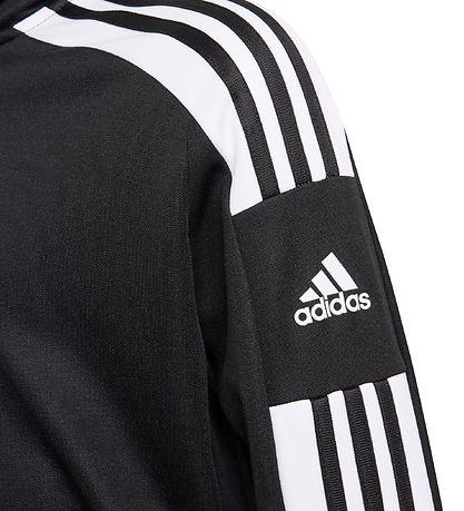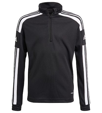 검은색의 멋진 adidas Performance (아디다스 퍼포먼스) 블라우스. 소매를 따라 좁은 흰색 줄무늬가 있고, 각 소매 상단에 흰색 로고가 인쇄되어 있습니다.