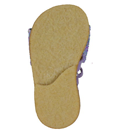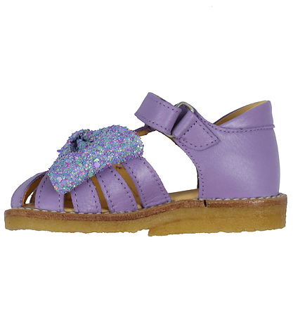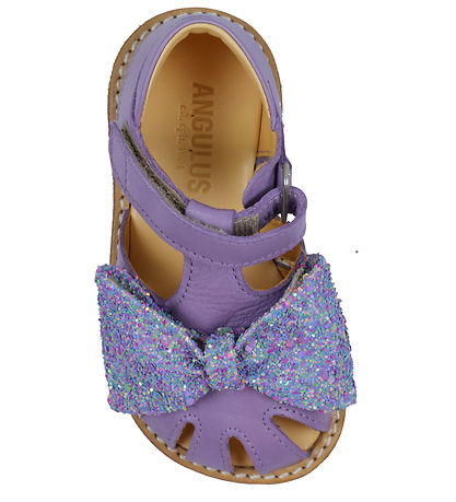 발가락 위에 다채로운 반짝이가 달린 큰 리본이 달린 보라색 가죽 소재의 아름다운 Angulus (앙굴루스) 샌들.