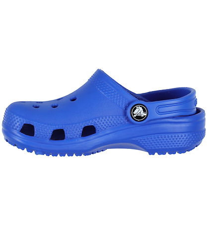 견고한 파란색의 세련된 Crocs (크록스) 샌들 로, 안과 밖 모두에 흑백으로 작은 로고가 새겨져 있습니다.